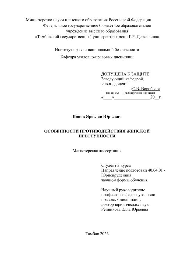 ПОПОВ, ЯРОСЛАВ ЮРЬЕВИЧ. ОСОБЕННОСТИ ПРОТИВОДЕЙСТВИЯ ЖЕНСКОЙ ПРЕСТУПНОСТИ [Электронный ресурс]: магистерская диссертация: 40.04.01 Юриспруденция: Заочная форма обучения / Я. Ю. ПОПОВ; ТГУ им. Г. Р. Державина ; науч. рук. д. ю. н., профессор, Э. Ю. Репникова. — Электрон. текстовые дан. (1 файл). — Тамбов, 2026. — Загл. с титул. экрана. — <URL:https://elibrary.tsutmb.ru/dl/docs/vkr19314.pdf>.