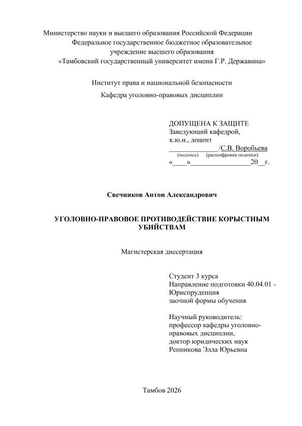 СВЕЧНИКОВ, АНТОН АЛЕКСАНДРОВИЧ. УГОЛОВНО-ПРАВОВОЕ ПРОТИВОДЕЙСТВИЕ КОРЫСТНЫМ УБИЙСТВАМ [Электронный ресурс]: магистерская диссертация: 40.04.01 Юриспруденция: Заочная форма обучения / А. А. СВЕЧНИКОВ; ТГУ им. Г. Р. Державина ; науч. рук. д. ю. н., профессор, Э. Ю. Репникова. — Электрон. текстовые дан. (1 файл). — Тамбов, 2026. — Загл. с титул. экрана. — <URL:https://elibrary.tsutmb.ru/dl/docs/vkr19315.pdf>.