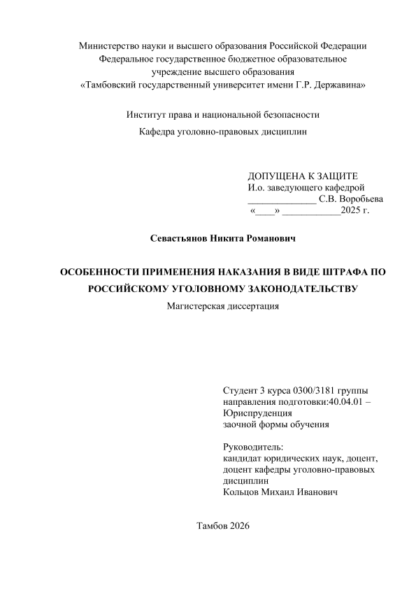 СЕВАСТЬЯНОВ, НИКИТА РОМАНОВИЧ. ОСОБЕННОСТИ ПРИМЕНЕНИЯ НАКАЗАНИЯ В ВИДЕ ШТРАФА ПО РОССИЙСКОМУ УГОЛОВНОМУ ЗАКОНОДАТЕЛЬСТВУ [Электронный ресурс]: магистерская диссертация: 40.04.01 Юриспруденция: Заочная форма обучения / Н. Р. СЕВАСТЬЯНОВ; ТГУ им. Г. Р. Державина ; науч. рук. к. ю. н., доцент, М. И. Кольцов. — Электрон. текстовые дан. (1 файл). — Тамбов, 2026. — Загл. с титул. экрана. — <URL:https://elibrary.tsutmb.ru/dl/docs/vkr19316.pdf>.