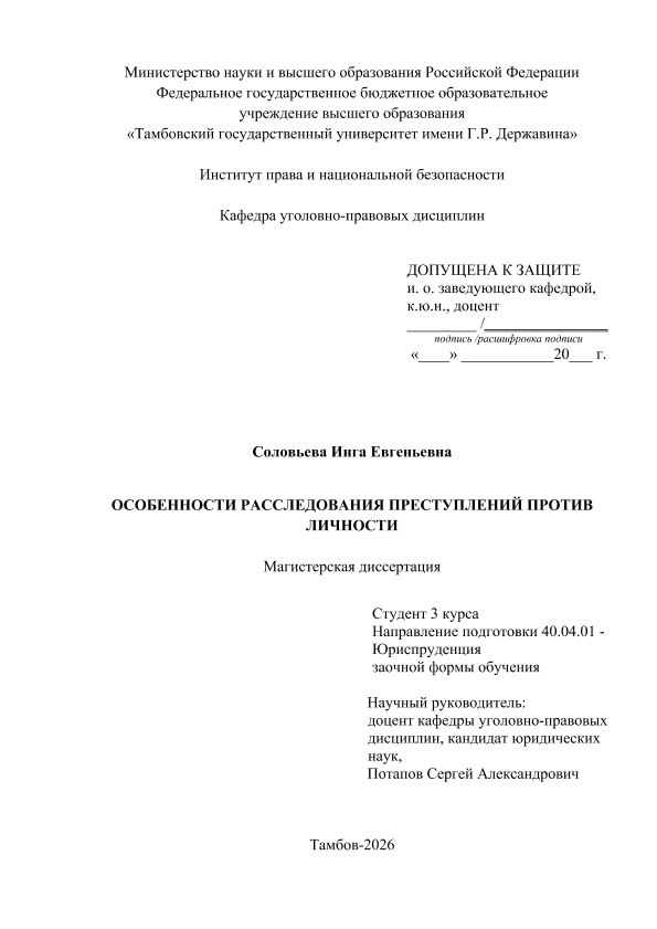 СОЛОВЬЕВА, ИНГА ЕВГЕНЬЕВНА. ОСОБЕННОСТИ РАССЛЕДОВАНИЯ ПРЕСТУПЛЕНИЙ ПРОТИВ ЛИЧНОСТИ [Электронный ресурс]: магистерская диссертация: 40.04.01 Юриспруденция: Заочная форма обучения / И. Е. СОЛОВЬЕВА; ТГУ им. Г. Р. Державина ; науч. рук. к. ю. н., доцент, С. А. Потапов. — Электрон. текстовые дан. (1 файл). — Тамбов, 2026. — Загл. с титул. экрана. — <URL:https://elibrary.tsutmb.ru/dl/docs/vkr19317.pdf>.