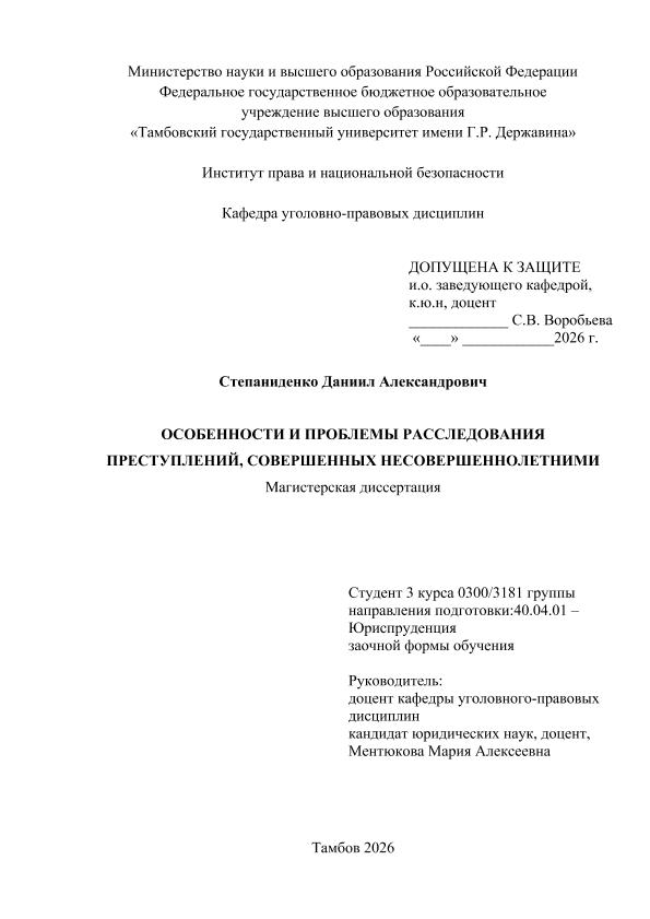 СТЕПАНИДЕНКО, ДАНИИЛ АЛЕКСАНДРОВИЧ. ОСОБЕННОСТИ И ПРОБЛЕМЫ РАССЛЕДОВАНИЯ ПРЕСТУПЛЕНИЙ, СОВЕРШЕННЫХ НЕСОВЕРШЕННОЛЕТНИМИ [Электронный ресурс]: магистерская диссертация: 40.04.01 Юриспруденция: Заочная форма обучения / Д. А. СТЕПАНИДЕНКО; ТГУ им. Г. Р. Державина ; науч. рук. к. ю. н., доцент, М. А. Ментюкова. — Электрон. текстовые дан. (1 файл). — Тамбов, 2026. — Загл. с титул. экрана. — <URL:https://elibrary.tsutmb.ru/dl/docs/vkr19318.pdf>.