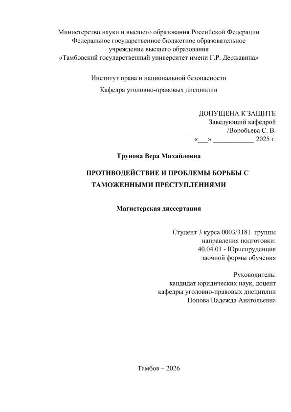 ТРУНОВА, ВЕРА МИХАЙЛОВНА. ПРОТИВОДЕЙСТВИЕ И ПРОБЛЕМЫ БОРЬБЫ С ТАМОЖЕННЫМИ ПРЕСТУПЛЕНИЯМИ [Электронный ресурс]: магистерская диссертация: 40.04.01 Юриспруденция: Заочная форма обучения / В. М. ТРУНОВА; ТГУ им. Г. Р. Державина ; науч. рук. к. ю. н., доцент, Н. А. Попова. — Электрон. текстовые дан. (1 файл). — Тамбов, 2026. — Загл. с титул. экрана. — <URL:https://elibrary.tsutmb.ru/dl/docs/vkr19319.pdf>.