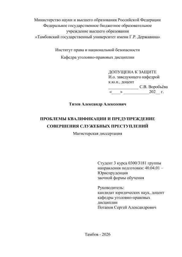 ТЯТЕВ, АЛЕКСАНДР АЛЕКСЕЕВИЧ. ПРОБЛЕМЫ КВАЛИФИКАЦИИ И ПРЕДУПРЕЖДЕНИЕ СОВЕРШЕНИЯ СЛУЖЕБНЫХ ПРЕСТУПЛЕНИЙ [Электронный ресурс]: магистерская диссертация: 40.04.01 Юриспруденция: Заочная форма обучения / А. А. ТЯТЕВ; ТГУ им. Г. Р. Державина ; науч. рук. к. ю. н., доцент, С. А. Потапов. — Электрон. текстовые дан. (1 файл). — Тамбов, 2026. — Загл. с титул. экрана. — <URL:https://elibrary.tsutmb.ru/dl/docs/vkr19320.pdf>.