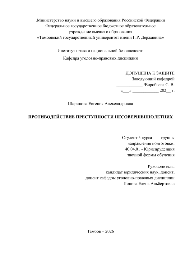 ШАРИПОВА, ЕВГЕНИЯ АЛЕКСАНДРОВНА. ПРОТИВОДЕЙСТВИЕ ПРЕСТУПНОСТИ НЕСОВЕРШЕННОЛЕТНИХ [Электронный ресурс]: магистерская диссертация: 40.04.01 Юриспруденция: Заочная форма обучения / Е. А. ШАРИПОВА; ТГУ им. Г. Р. Державина ; науч. рук. к. ю. н., доцент, Е. А. Попова. — Электрон. текстовые дан. (1 файл). — Тамбов, 2026. — Загл. с титул. экрана. — <URL:https://elibrary.tsutmb.ru/dl/docs/vkr19322.pdf>.