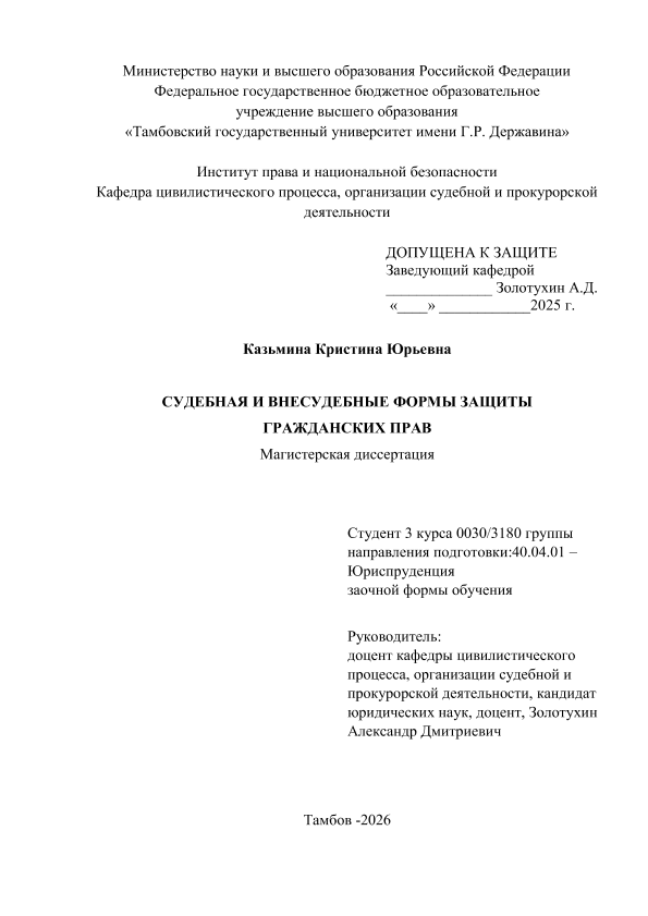 КАЗЬМИНА, КРИСТИНА ЮРЬЕВНА. СУДЕБНАЯ И ВНЕСУДЕБНЫЕ ФОРМЫ ЗАЩИТЫ ГРАЖДАНСКИХ ПРАВ [Электронный ресурс]: магистерская диссертация: 40.04.01 Юриспруденция: Судебная защита гражданских прав, исполнительная, нотариальная и адвокатская деятельность: Заочная форма обучения / К. Ю. КАЗЬМИНА; ТГУ им. Г. Р. Державина ; науч. рук. к. ю. н., доцент, А. Д. Золотухин. — Электрон. текстовые дан. (1 файл). — Тамбов, 2025. — Загл. с титул. экрана. — <URL:https://elibrary.tsutmb.ru/dl/docs/vkr18917.pdf>.