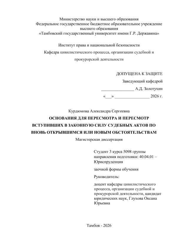 КУРДЮМОВА, АЛЕКСАНДРА СЕРГЕЕВНА. ОСНОВАНИЯ ДЛЯ ПЕРЕСМОТРА И ПЕРЕСМОТР ВСТУПИВШИХ В ЗАКОННУЮ СИЛУ СУДЕБНЫХ АКТОВ ПО ВНОВЬ ОТКРЫВШИМСЯ ИЛИ НОВЫМ ОБСТОЯТЕЛЬСТВАМ [Электронный ресурс]: магистерская диссертация: 40.04.01 Юриспруденция: Судебная защита гражданских прав, исполнительная, нотариальная и адвокатская деятельность: Заочная форма обучения / А. С. КУРДЮМОВА; ТГУ им. Г. Р. Державина ; науч. рук. к. ю. н., доцент, О. Ю. Глухова. — Электрон. текстовые дан. (1 файл). — Тамбов, 2025. — Загл. с титул. экрана. — <URL:https://elibrary.tsutmb.ru/dl/docs/vkr18918.pdf>.
