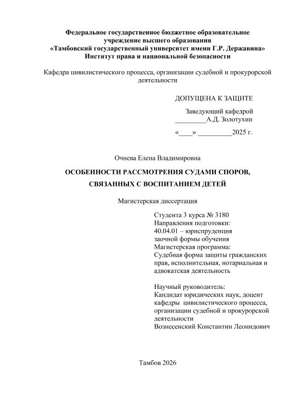 ОЧНЕВА, ЕЛЕНА ВЛАДИМИРОВНА. ОСОБЕННОСТИ РАССМОТРЕНИЯ СУДАМИ СПОРОВ, СВЯЗАННЫХ С ВОСПИТАНИЕМ ДЕТЕЙ [Электронный ресурс]: магистерская диссертация: 40.04.01 Юриспруденция: Судебная защита гражданских прав, исполнительная, нотариальная и адвокатская деятельность: Заочная форма обучения / Е. В. ОЧНЕВА; ТГУ им. Г. Р. Державина ; науч. рук. к. ю. н., доцент, К. Л. Вознесенский. — Электрон. текстовые дан. (1 файл). — Тамбов, 2025. — Загл. с титул. экрана. — <URL:https://elibrary.tsutmb.ru/dl/docs/vkr18921.pdf>.