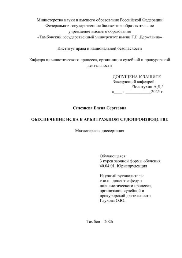 СЕЛЕЗНЕВА, ЕЛЕНА СЕРГЕЕВНА. ОБЕСПЕЧЕНИЕ ИСКА В АРБИТРАЖНОМ СУДОПРОИЗВОДСТВЕ [Электронный ресурс]: магистерская диссертация: 40.04.01 Юриспруденция: Судебная защита гражданских прав, исполнительная, нотариальная и адвокатская деятельность: Заочная форма обучения / Е. С. СЕЛЕЗНЕВА; ТГУ им. Г. Р. Державина ; науч. рук. к. ю. н., доцент, О. Ю. Глухова. — Электрон. текстовые дан. (1 файл). — Тамбов, 2025. — Загл. с титул. экрана. — <URL:https://elibrary.tsutmb.ru/dl/docs/vkr18922.pdf>.