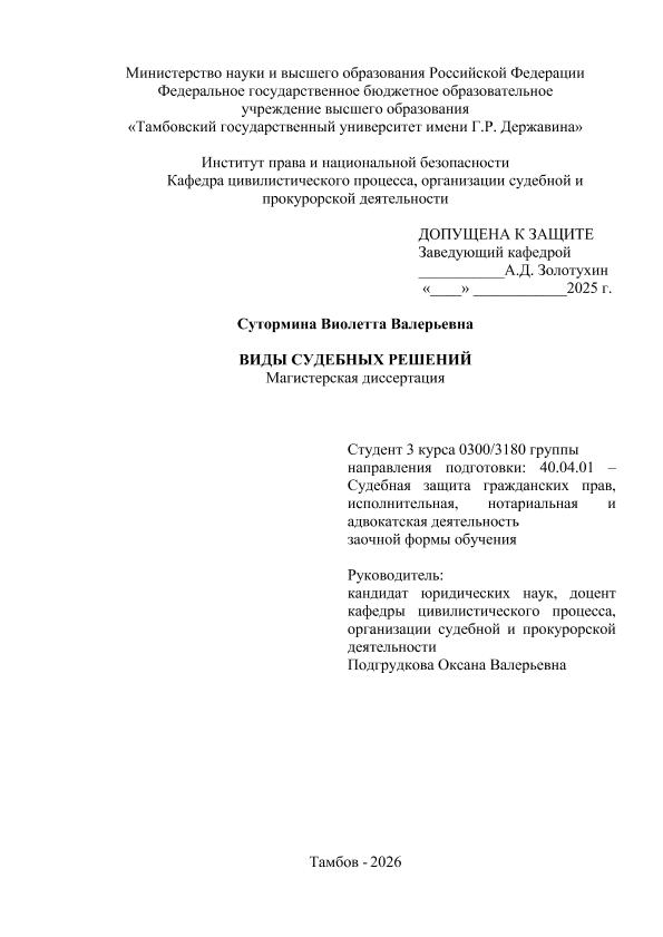 СУТОРМИНА, ВИОЛЕТТА ВАЛЕРЬЕВНА. ВИДЫ СУДЕБНЫХ РЕШЕНИЙ [Электронный ресурс]: магистерская диссертация: 40.04.01 Юриспруденция: Судебная защита гражданских прав, исполнительная, нотариальная и адвокатская деятельность: Заочная форма обучения / В. В. СУТОРМИНА; ТГУ им. Г. Р. Державина ; науч. рук. к. ю. н., доцент, О. В. Подгрудкова. — Электрон. текстовые дан. (1 файл). — Тамбов, 2025. — Загл. с титул. экрана. — <URL:https://elibrary.tsutmb.ru/dl/docs/vkr18925.pdf>.