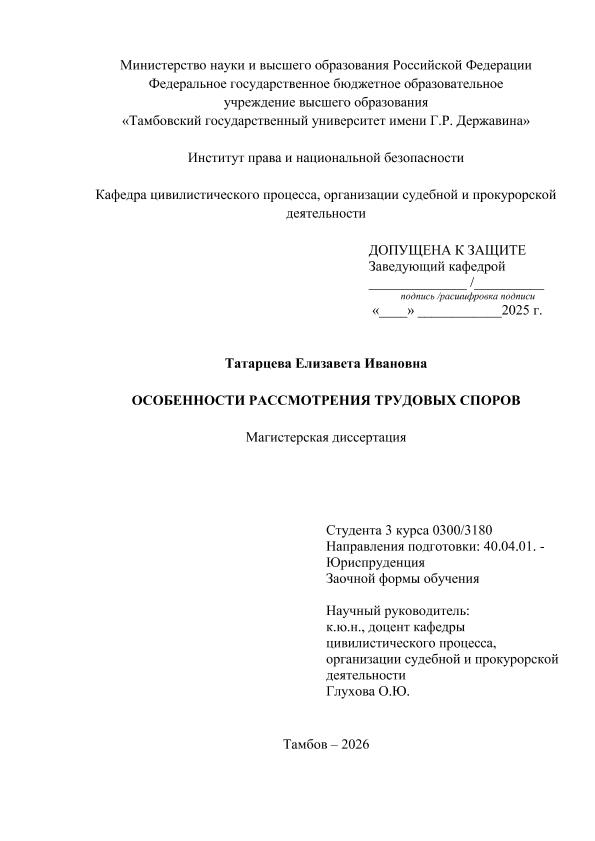 ТАТАРЦЕВА, ЕЛИЗАВЕТА ИВАНОВНА. ОСОБЕННОСТИ РАССМОТРЕНИЯ ТРУДОВЫХ СПОРОВ [Электронный ресурс]: магистерская диссертация: 40.04.01 Юриспруденция: Судебная защита гражданских прав, исполнительная, нотариальная и адвокатская деятельность: Заочная форма обучения / Е. И. ТАТАРЦЕВА; ТГУ им. Г. Р. Державина ; науч. рук. к. ю. н., доцент, О. Ю. Глухова. — Электрон. текстовые дан. (1 файл). — Тамбов, 2025. — Загл. с титул. экрана. — <URL:https://elibrary.tsutmb.ru/dl/docs/vkr18926.pdf>.