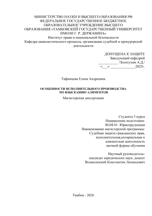 ТАФИНЦЕВА, ЕЛЕНА АНДРЕЕВНА. ОСОБЕННОСТИ ИСПОЛНИТЕЛЬНОГО ПРОИЗВОДСТВА ПО ВЗЫСКАНИЮ АЛИМЕНТОВ [Электронный ресурс]: магистерская диссертация: 40.04.01 Юриспруденция: Судебная защита гражданских прав, исполнительная, нотариальная и адвокатская деятельность: Заочная форма обучения / Е. А. ТАФИНЦЕВА; ТГУ им. Г. Р. Державина ; науч. рук. к. ю. н., доцент, К. Л. Вознесенский. — Электрон. текстовые дан. (1 файл). — Тамбов, 2025. — Загл. с титул. экрана. — <URL:https://elibrary.tsutmb.ru/dl/docs/vkr18927.pdf>.