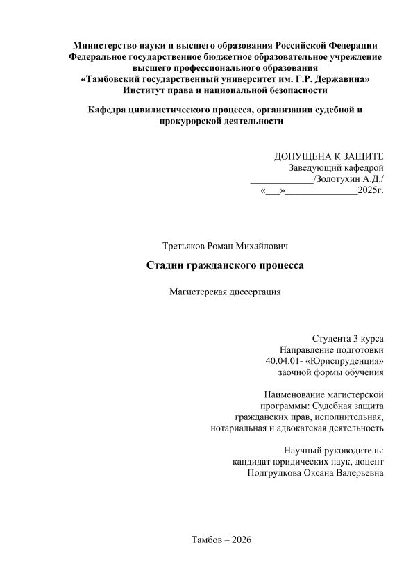 ТРЕТЬЯКОВ, РОМАН МИХАЙЛОВИЧ. СТАДИИ ГРАЖДАНСКОГО ПРОЦЕССА [Электронный ресурс]: магистерская диссертация: 40.04.01 Юриспруденция: Судебная защита гражданских прав, исполнительная, нотариальная и адвокатская деятельность: Заочная форма обучения / Р. М. ТРЕТЬЯКОВ; ТГУ им. Г. Р. Державина ; науч. рук. к. ю. н., доцент, О. В. Подгрудкова. — Электрон. текстовые дан. (1 файл). — Тамбов, 2025. — Загл. с титул. экрана. — <URL:https://elibrary.tsutmb.ru/dl/docs/vkr18928.pdf>.