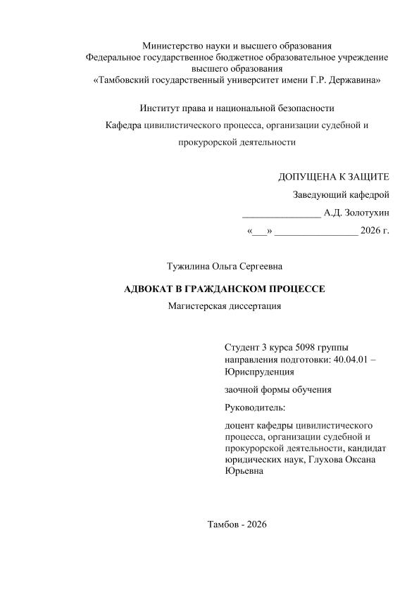ТУЖИЛИНА, ОЛЬГА СЕРГЕЕВНА. АДВОКАТ В ГРАЖДАНСКОМ ПРОЦЕССЕ [Электронный ресурс]: магистерская диссертация: 40.04.01 Юриспруденция: Судебная защита гражданских прав, исполнительная, нотариальная и адвокатская деятельность: Заочная форма обучения / О. С. ТУЖИЛИНА; ТГУ им. Г. Р. Державина ; науч. рук. к. ю. н., доцент, О. Ю. Глухова. — Электрон. текстовые дан. (1 файл). — Тамбов, 2025. — Загл. с титул. экрана. — <URL:https://elibrary.tsutmb.ru/dl/docs/vkr18930.pdf>.