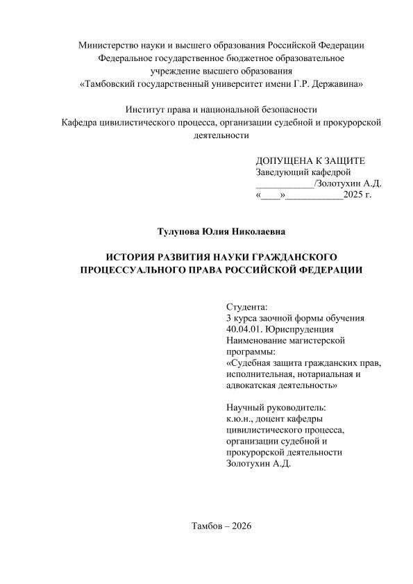 ТУЛУПОВА, ЮЛИЯ НИКОЛАЕВНА. ИСТОРИЯ РАЗВИТИЯ НАУКИ ГРАЖДАНСКОГО ПРОЦЕССУАЛЬНОГО ПРАВА РОССИЙСКОЙ ФЕДЕРАЦИИ [Электронный ресурс]: магистерская диссертация: 40.04.01 Юриспруденция: Судебная защита гражданских прав, исполнительная, нотариальная и адвокатская деятельность: Заочная форма обучения / Ю. Н. ТУЛУПОВА; ТГУ им. Г. Р. Державина ; науч. рук. к. ю. н., доцент, А. Д. Золотухин. — Электрон. текстовые дан. (1 файл). — Тамбов, 2025. — Загл. с титул. экрана. — <URL:https://elibrary.tsutmb.ru/dl/docs/vkr18931.pdf>.