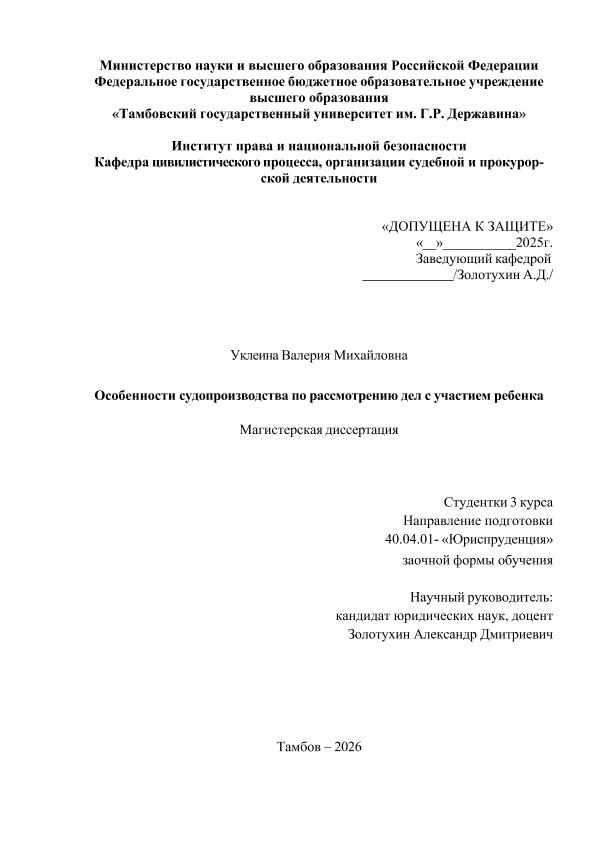 УКЛЕИНА, ВАЛЕРИЯ МИХАЙЛОВНА. ОСОБЕННОСТИ СУДОПРОИЗВОДСТВА ПО РАССМОТРЕНИЮ ДЕЛ С УЧАСТИЕМ РЕБЕНКА [Электронный ресурс]: магистерская диссертация: 40.04.01 Юриспруденция: Судебная защита гражданских прав, исполнительная, нотариальная и адвокатская деятельность: Заочная форма обучения / В. М. УКЛЕИНА; ТГУ им. Г. Р. Державина ; науч. рук. к. ю. н., доцент, А. Д. Золотухин. — Электрон. текстовые дан. (1 файл). — Тамбов, 2025. — Загл. с титул. экрана. — <URL:https://elibrary.tsutmb.ru/dl/docs/vkr18932.pdf>.