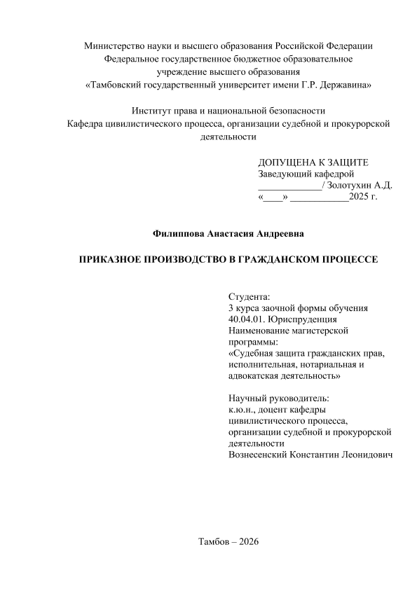 ФИЛИППОВА, АНАСТАСИЯ АНДРЕЕВНА. ПРИКАЗНОЕ ПРОИЗВОДСТВО В ГРАЖДАНСКОМ ПРОЦЕССЕ [Электронный ресурс]: магистерская диссертация: 40.04.01 Юриспруденция: Судебная защита гражданских прав, исполнительная, нотариальная и адвокатская деятельность: Заочная форма обучения / А. А. ФИЛИППОВА; ТГУ им. Г. Р. Державина ; науч. рук. к. ю. н., доцент, К. Л. Вознесенский. — Электрон. текстовые дан. (1 файл). — Тамбов, 2025. — Загл. с титул. экрана. — <URL:https://elibrary.tsutmb.ru/dl/docs/vkr18933.pdf>.