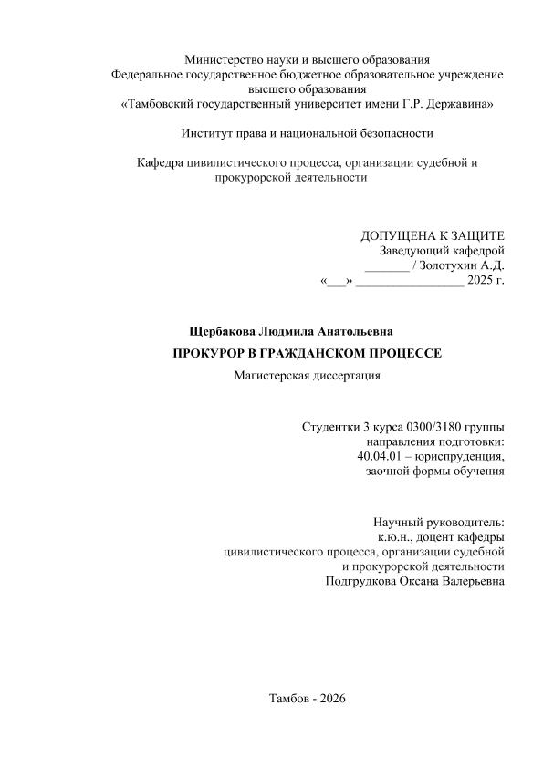 ЩЕРБАКОВА, ЛЮДМИЛА АНАТОЛЬЕВНА. ПРОКУРОР В ГРАЖДАНСКОМ ПРОЦЕССЕ [Электронный ресурс]: магистерская диссертация: 40.04.01 Юриспруденция: Судебная защита гражданских прав, исполнительная, нотариальная и адвокатская деятельность: Заочная форма обучения / Л. А. ЩЕРБАКОВА; ТГУ им. Г. Р. Державина ; науч. рук. к. ю. н., доцент, О. В. Подгрудкова. — Электрон. текстовые дан. (1 файл). — Тамбов, 2025. — Загл. с титул. экрана. — <URL:https://elibrary.tsutmb.ru/dl/docs/vkr18934.pdf>.