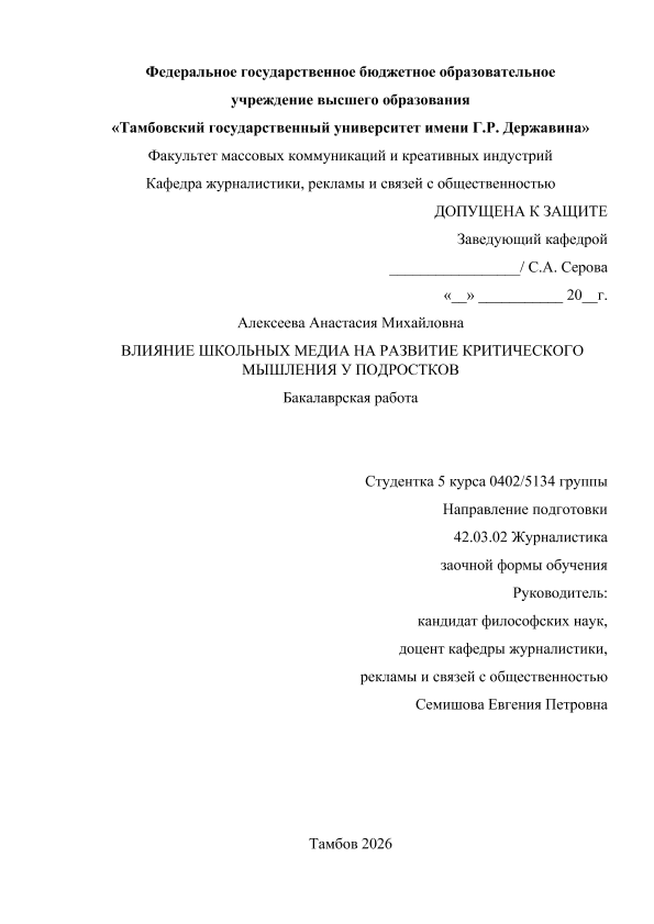 АЛЕКСЕЕВА, АНАСТАСИЯ МИХАЙЛОВНА. ВЛИЯНИЕ ШКОЛЬНЫХ МЕДИА НА РАЗВИТИЕ КРИТИЧЕСКОГО МЫШЛЕНИЯ У ПОДРОСТКОВ [Электронный ресурс]: бакалаврская работа: 42.03.02 Журналистика: Заочная форма обучения / А. М. АЛЕКСЕЕВА; ТГУ им. Г. Р. Державина ; науч. рук. к. филос. н., доцент, Е. П. Семишова. — Электрон. текстовые дан. (1 файл). — Тамбов, 2026. — Загл. с титул. экрана. — <URL:https://elibrary.tsutmb.ru/dl/docs/vkr18935.pdf>.