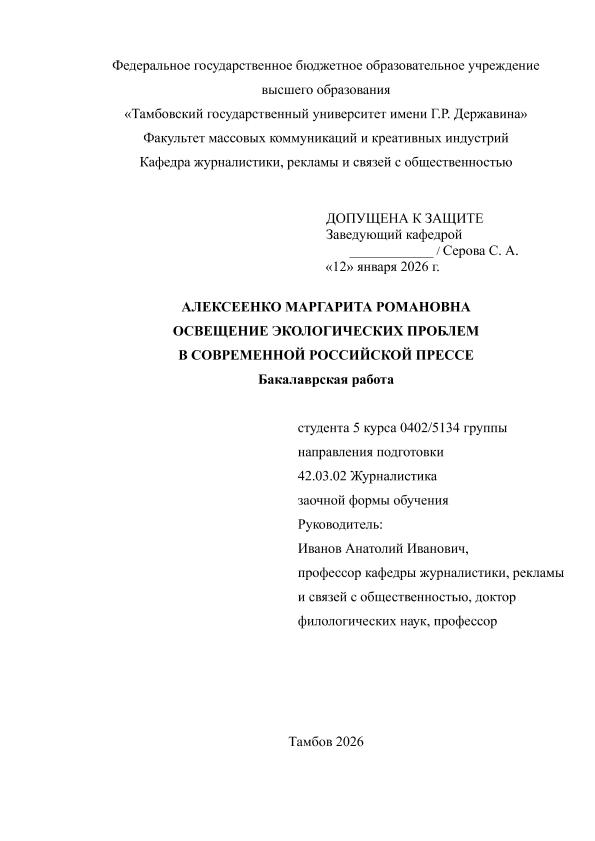 АЛЕКСЕЕНКО, МАРГАРИТА РОМАНОВНА. ОСВЕЩЕНИЕ ЭКОЛОГИЧЕСКИХ ПРОБЛЕМ В СОВРЕМЕННОЙ РОССИЙСКОЙ ПРЕССЕ [Электронный ресурс]: бакалаврская работа: 42.03.02 Журналистика: Заочная форма обучения / М. Р. АЛЕКСЕЕНКО; ТГУ им. Г. Р. Державина ; науч. рук. д. ф. н., профессор, А. И. Иванов. — Электрон. текстовые дан. (1 файл). — Тамбов, 2026. — Загл. с титул. экрана. — <URL:https://elibrary.tsutmb.ru/dl/docs/vkr18936.pdf>.