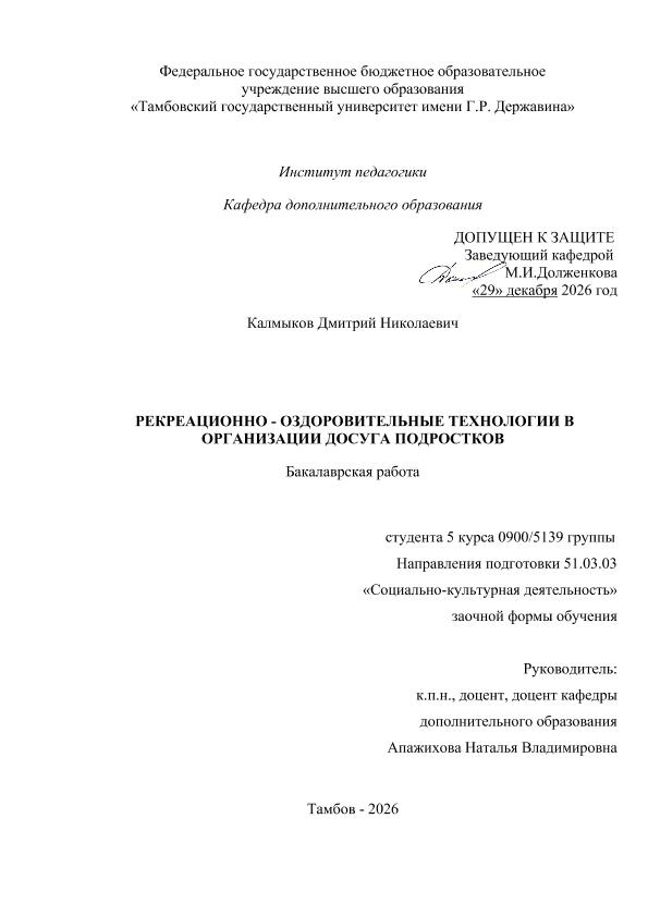 КАЛМЫКОВ, ДМИТРИЙ НИКОЛАЕВИЧ. РЕКРЕАЦИОННО - ОЗДОРОВИТЕЛЬНЫЕ ТЕХНОЛОГИИ В ОРГАНИЗАЦИИ ДОСУГА ПОДРОСТКОВ [Электронный ресурс]: бакалаврская работа: 51.03.03 Социально-культурная деятельность: Заочная форма обучения / Д. Н. КАЛМЫКОВ; ТГУ им. Г. Р. Державина ; науч. рук. к. пед. н., доцент, Н. В. Апажихова. — Электрон. текстовые дан. (1 файл). — Тамбов, 2025. — Загл. с титул. экрана. — <URL:https://elibrary.tsutmb.ru/dl/docs/vkr18957.pdf>.