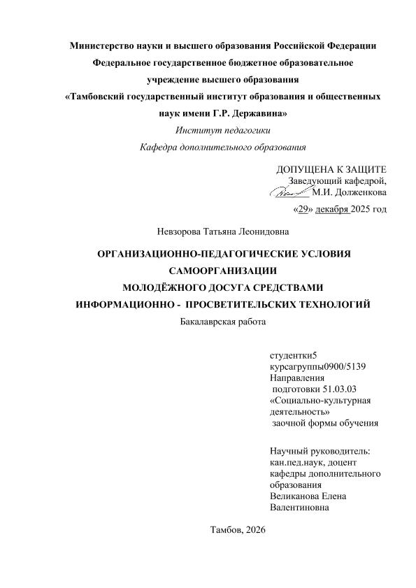 НЕВЗОРОВА, ТАТЬЯНА ЛЕОНИДОВНА. ОРГАНИЗАЦИОННО-ПЕДАГОГИЧЕСКИЕ УСЛОВИЯ САМООРГАНИЗАЦИИ МОЛОДЕЖНОГО ДОСУГА СРЕДСТВАМИ ИНФОРМАЦИОННО - ПРОСВЕТИТЕЛЬСКИХ ТЕХНОЛОГИЙ [Электронный ресурс]: бакалаврская работа: 51.03.03 Социально-культурная деятельность: Заочная форма обучения / Т. Л. НЕВЗОРОВА; ТГУ им. Г. Р. Державина ; науч. рук. к. пед. н., доцент, Е. В. Великанова. — Электрон. текстовые дан. (1 файл). — Тамбов, 2025. — Загл. с титул. экрана. — <URL:https://elibrary.tsutmb.ru/dl/docs/vkr18959.pdf>.