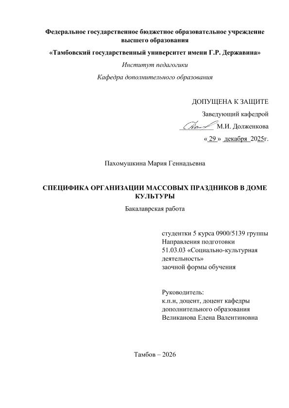 ПАХОМУШКИНА, МАРИЯ ГЕННАДЬЕВНА. СПЕЦИФИКА ОРГАНИЗАЦИИ МАССОВЫХ ПРАЗДНИКОВ В ДОМЕ КУЛЬТУРЫ [Электронный ресурс]: бакалаврская работа: 51.03.03 Социально-культурная деятельность: Заочная форма обучения / М. Г. ПАХОМУШКИНА; ТГУ им. Г. Р. Державина ; науч. рук. к. пед. н., доцент, Е. В. Великанова. — Электрон. текстовые дан. (1 файл). — Тамбов, 2025. — Загл. с титул. экрана. — <URL:https://elibrary.tsutmb.ru/dl/docs/vkr18961.pdf>.