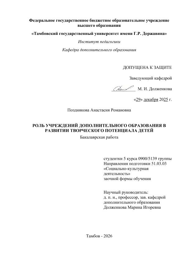 ПОЗДНЯКОВА, АНАСТАСИЯ РОМАНОВНА. РОЛЬ УЧРЕЖДЕНИЙ ДОПОЛНИТЕЛЬНОГО ОБРАЗОВАНИЯ В РАЗВИТИИ ТВОРЧЕСКОГО ПОТЕНЦИАЛА ДЕТЕЙ [Электронный ресурс]: бакалаврская работа: 51.03.03 Социально-культурная деятельность: Заочная форма обучения / А. Р. ПОЗДНЯКОВА; ТГУ им. Г. Р. Державина ; науч. рук. д. пед. н., профессор, М. И. Долженкова. — Электрон. текстовые дан. (1 файл). — Тамбов, 2025. — Загл. с титул. экрана. — <URL:https://elibrary.tsutmb.ru/dl/docs/vkr18962.pdf>.