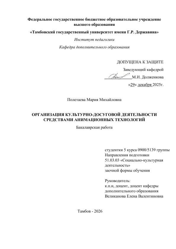 ПОЛЕТАЕВА, МАРИЯ МИХАЙЛОВНА. ОРГАНИЗАЦИЯ КУЛЬТУРНО-ДОСУГОВОЙ ДЕЯТЕЛЬНОСТИ СРЕДСТВАМИ АНИМАЦИОННЫХ ТЕХНОЛОГИЙ [Электронный ресурс]: бакалаврская работа: 51.03.03 Социально-культурная деятельность: Заочная форма обучения / М. М. ПОЛЕТАЕВА; ТГУ им. Г. Р. Державина ; науч. рук. к. пед. н., доцент, Е. В. Великанова. — Электрон. текстовые дан. (1 файл). — Тамбов, 2025. — Загл. с титул. экрана. — <URL:https://elibrary.tsutmb.ru/dl/docs/vkr18963.pdf>.