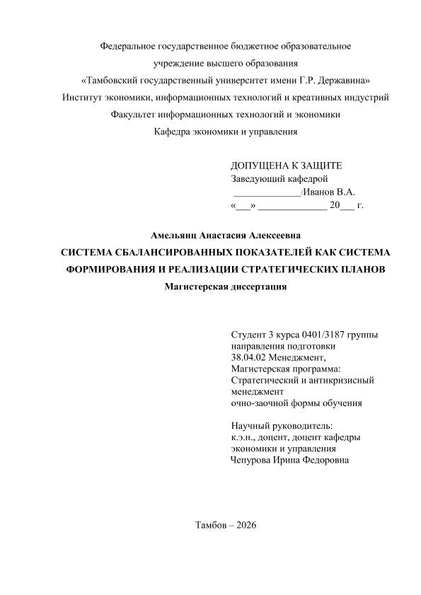 АМЕЛЬЯНЦ, АНАСТАСИЯ АЛЕКСЕЕВНА. СИСТЕМА СБАЛАНСИРОВАННЫХ ПОКАЗАТЕЛЕЙ КАК СИСТЕМА ФОРМИРОВАНИЯ И РЕАЛИЗАЦИИ СТРАТЕГИЧЕСКИХ ПЛАНОВ [Электронный ресурс]: магистерская диссертация: 38.04.02 Менеджмент: Стратегический и антикризисный менеджмент: Очно-заочная форма обучения / А. А. АМЕЛЬЯНЦ; ТГУ им. Г. Р. Державина ; науч. рук. к. э. н., доцент, И. Ф. ЧЕПУРОВА. — Электрон. текстовые дан. (1 файл). — Тамбов, 2026. — Загл. с титул. экрана. — <URL:https://elibrary.tsutmb.ru/dl/docs/vkr18967.pdf>.