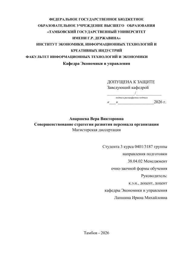 АПАРШЕВА, ВЕРА ВИКТОРОВНА. СОВЕРШЕНСТВОВАНИЕ СТРАТЕГИИ РАЗВИТИЯ ПЕРСОНАЛА ОРГАНИЗАЦИИ [Электронный ресурс]: магистерская диссертация: 38.04.02 Менеджмент: Стратегический и антикризисный менеджмент: Очно-заочная форма обучения / В. В. АПАРШЕВА; ТГУ им. Г. Р. Державина ; науч. рук. к. э. н., доцент, И. М. Лапшина. — Электрон. текстовые дан. (1 файл). — Тамбов, 2026. — Загл. с титул. экрана. — <URL:https://elibrary.tsutmb.ru/dl/docs/vkr18968.pdf>.