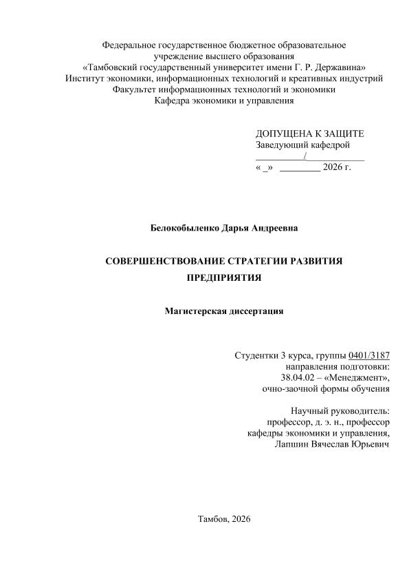 БЕЛОКОБЫЛЕНКО, ДАРЬЯ АНДРЕЕВНА. СОВЕРШЕНСТВОВАНИЕ СТРАТЕГИИ РАЗВИТИЯ ПРЕДПРИЯТИЯ [Электронный ресурс]: магистерская диссертация: 38.04.02 Менеджмент: Стратегический и антикризисный менеджмент: Очно-заочная форма обучения / Д. А. БЕЛОКОБЫЛЕНКО; ТГУ им. Г. Р. Державина ; науч. рук. д. э. н., профессор, В. Ю. Лапшин. — Электрон. текстовые дан. (1 файл). — Тамбов, 2026. — Загл. с титул. экрана. — <URL:https://elibrary.tsutmb.ru/dl/docs/vkr18969.pdf>.