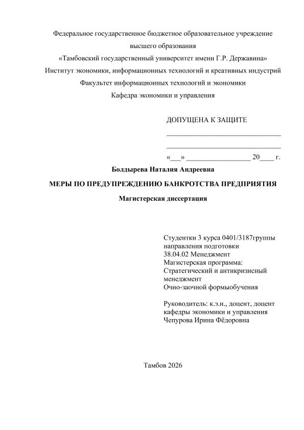 БОЛДЫРЕВА, НАТАЛИЯ АНДРЕЕВНА. МЕРЫ ПО ПРЕДУПРЕЖДЕНИЮ БАНКРОТСТВА ПРЕДПРИЯТИЯ [Электронный ресурс]: магистерская диссертация: 38.04.02 Менеджмент: Стратегический и антикризисный менеджмент: Очно-заочная форма обучения / Н. А. БОЛДЫРЕВА; ТГУ им. Г. Р. Державина ; науч. рук. к. э. н., доцент, И. Ф. Чепурова. — Электрон. текстовые дан. (1 файл). — Тамбов, 2026. — Загл. с титул. экрана. — <URL:https://elibrary.tsutmb.ru/dl/docs/vkr18970.pdf>.