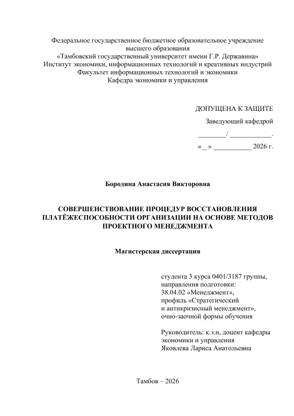 БОРОДИНА, АНАСТАСИЯ ВИКТОРОВНА. СОВЕРШЕНСТВОВАНИЕ ПРОЦЕДУР ВОССТАНОВЛЕНИЯ ПЛАТЕЖЕСПОСОБНОСТИ ОРГАНИЗАЦИИ НА ОСНОВЕ МЕТОДОВ ПРОЕКТНОГО МЕНЕДЖМЕНТА [Электронный ресурс]: магистерская диссертация: 38.04.02 Менеджмент: Стратегический и антикризисный менеджмент: Очно-заочная форма обучения / А. В. БОРОДИНА; ТГУ им. Г. Р. Державина ; науч. рук. к. э. н., доцент, Л. А. Яковлева. — Электрон. текстовые дан. (1 файл). — Тамбов, 2026. — Загл. с титул. экрана. — <URL:https://elibrary.tsutmb.ru/dl/docs/vkr18971.pdf>.