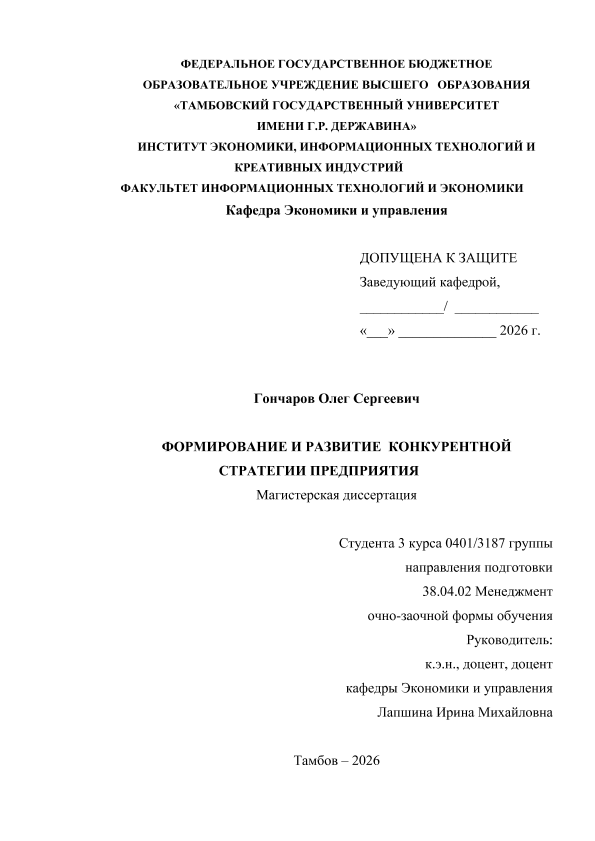 ГОНЧАРОВ, ОЛЕГ СЕРГЕЕВИЧ. ФОРМИРОВАНИЕ И РАЗВИТИЕ КОНКУРЕНТНОЙ СТРАТЕГИИ ПРЕДПРИЯТИЯ [Электронный ресурс]: магистерская диссертация: 38.04.02 Менеджмент: Стратегический и антикризисный менеджмент: Очно-заочная форма обучения / О. С. ГОНЧАРОВ; ТГУ им. Г. Р. Державина ; науч. рук. к. э. н., доцент, И. М. Лапшина. — Электрон. текстовые дан. (1 файл). — Тамбов, 2026. — Загл. с титул. экрана. — <URL:https://elibrary.tsutmb.ru/dl/docs/vkr18972.pdf>.