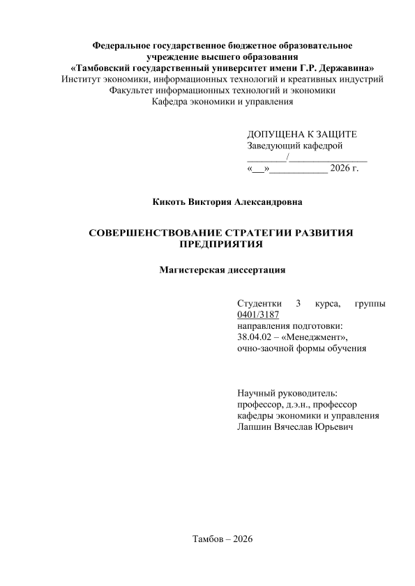 КИКОТЬ, ВИКТОРИЯ АЛЕКСАНДРОВНА. СОВЕРШЕНСТВОВАНИЕ СТРАТЕГИИ РАЗВИТИЯ ПРЕДПРИЯТИЯ [Электронный ресурс]: магистерская диссертация: 38.04.02 Менеджмент: Стратегический и антикризисный менеджмент: Очно-заочная форма обучения / В. А. КИКОТЬ; ТГУ им. Г. Р. Державина ; науч. рук. д. э. н., профессор, В. Ю. Лапшин. — Электрон. текстовые дан. (1 файл). — Тамбов, 2026. — Загл. с титул. экрана. — <URL:https://elibrary.tsutmb.ru/dl/docs/vkr18973.pdf>.