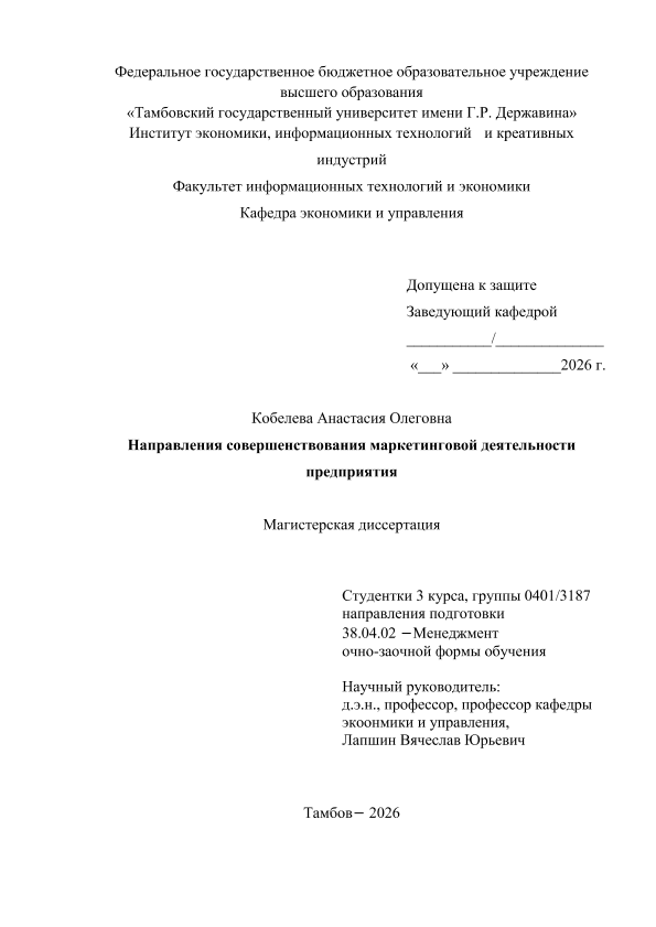 КОБЕЛЕВА, АНАСТАСИЯ ОЛЕГОВНА. НАПРАВЛЕНИЯ СОВЕРШЕНСТВОВАНИЯ МАРКЕТИНГОВОЙ ДЕЯТЕЛЬНОСТИ ПРЕДПРИЯТИЯ [Электронный ресурс]: магистерская диссертация: 38.04.02 Менеджмент: Стратегический и антикризисный менеджмент: Очно-заочная форма обучения / А. О. КОБЕЛЕВА; ТГУ им. Г. Р. Державина ; науч. рук. д. э. н., профессор, В. Ю. Лапшин. — Электрон. текстовые дан. (1 файл). — Тамбов, 2026. — Загл. с титул. экрана. — <URL:https://elibrary.tsutmb.ru/dl/docs/vkr18974.pdf>.