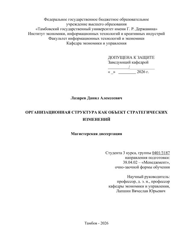 ЛАЗАРЕВ, ДАНИЛ АЛЕКСЕЕВИЧ. ОРГАНИЗАЦИОННАЯ СТРУКТУРА КАК ОБЪЕКТ СТРАТЕГИЧЕСКИХ ИЗМЕНЕНИЙ [Электронный ресурс]: магистерская диссертация: 38.04.02 Менеджмент: Стратегический и антикризисный менеджмент: Очно-заочная форма обучения / Д. А. ЛАЗАРЕВ; ТГУ им. Г. Р. Державина ; науч. рук. д. э. н., профессор, В. Ю. Лапшин. — Электрон. текстовые дан. (1 файл). — Тамбов, 2026. — Загл. с титул. экрана. — <URL:https://elibrary.tsutmb.ru/dl/docs/vkr18975.pdf>.