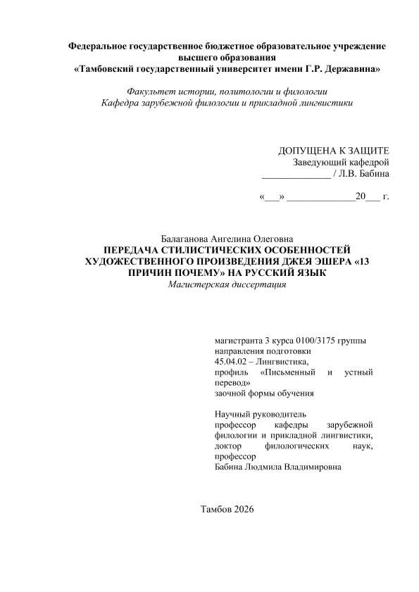 БАЛАГАНОВА, АНГЕЛИНА ОЛЕГОВНА. ПЕРЕДАЧА СТИЛИСТИЧЕСКИХ ОСОБЕННОСТЕЙ ХУДОЖЕСТВЕННОГО ПРОИЗВЕДЕНИЯ ДЖЕЯ ЭШЕРА «13 ПРИЧИН ПОЧЕМУ» НА РУССКИЙ ЯЗЫК [Электронный ресурс]: магистерская диссертация: 45.04.02 Лингвистика: Письменный и устный перевод: Заочная форма обучения / А. О. БАЛАГАНОВА; ТГУ им. Г. Р. Державина ; науч. рук. д. ф. н., профессор, Л. В. Бабина. — Электрон. текстовые дан. (1 файл). — Тамбов, 2026. — Загл. с титул. экрана. — <URL:https://elibrary.tsutmb.ru/dl/docs/vkr19047.pdf>.