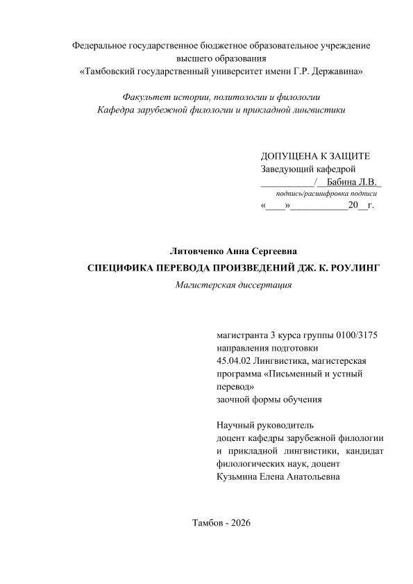 ЛИТОВЧЕНКО, АННА СЕРГЕЕВНА. СПЕЦИФИКА ПЕРЕВОДА ПРОИЗВЕДЕНИЙ ДЖ. К. РОУЛИНГ [Электронный ресурс]: магистерская диссертация: 45.04.02 Лингвистика: Письменный и устный перевод: Заочная форма обучения / А. С. ЛИТОВЧЕНКО; ТГУ им. Г. Р. Державина ; науч. рук. к. ф. н., доцент, Е. А. Кузьмина. — Электрон. текстовые дан. (1 файл). — Тамбов, 2026. — Загл. с титул. экрана. — <URL:https://elibrary.tsutmb.ru/dl/docs/vkr19048.pdf>.