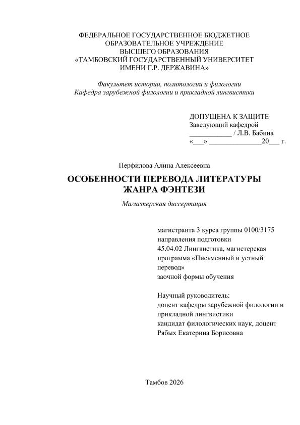 ПЕРФИЛОВА, АЛИНА АЛЕКСЕЕВНА. ОСОБЕННОСТИ ПЕРЕВОДА ЛИТЕРАТУРЫ ЖАНРА ФЭНТЕЗИ [Электронный ресурс]: магистерская диссертация: 45.04.02 Лингвистика: Письменный и устный перевод: Заочная форма обучения / А. А. ПЕРФИЛОВА; ТГУ им. Г. Р. Державина ; науч. рук. к. ф. н., доцент, Е. Б. Рябых. — Электрон. текстовые дан. (1 файл). — Тамбов, 2026. — Загл. с титул. экрана. — <URL:https://elibrary.tsutmb.ru/dl/docs/vkr19049.pdf>.