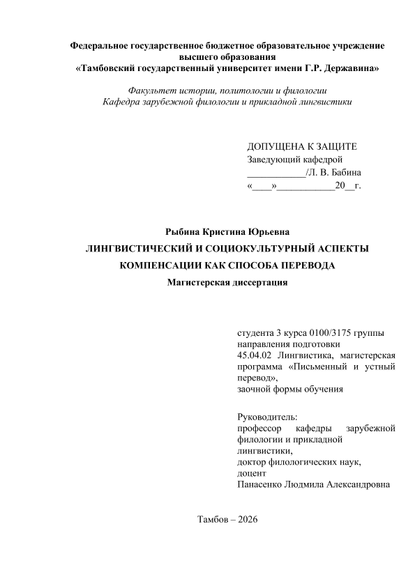 РЫБИНА, КРИСТИНА ЮРЬЕВНА. ЛИНГВИСТИЧЕСКИЙ И СОЦИОКУЛЬТУРНЫЙ АСПЕКТЫ КОМПЕНСАЦИИ КАК СПОСОБА ПЕРЕВОДА [Электронный ресурс]: магистерская диссертация: 45.04.02 Лингвистика: Письменный и устный перевод: Заочная форма обучения / К. Ю. РЫБИНА; ТГУ им. Г. Р. Державина ; науч. рук. д. ф. н., профессор, Л. А. Панасенко. — Электрон. текстовые дан. (1 файл). — Тамбов, 2026. — Загл. с титул. экрана. — <URL:https://elibrary.tsutmb.ru/dl/docs/vkr19050.pdf>.