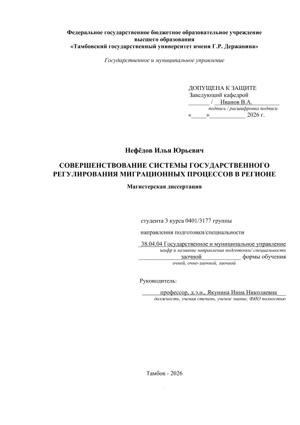 НЕФЕДОВ, ИЛЬЯ ЮРЬЕВИЧ. СОВЕРШЕНСТВОВАНИЕ СИСТЕМЫ ГОСУДАРСТВЕННОГО РЕГУЛИРОВАНИЯ МИГРАЦИОННЫХ ПРОЦЕССОВ В РЕГИОНЕ [Электронный ресурс]: магистерская диссертация: 38.04.04 Государственное и муниципальное управление: Управление проектами государственно-частного партнерства: Заочная форма обучения / И. Ю. НЕФЕДОВ; ТГУ им. Г. Р. Державина ; науч. рук. д. э. н., профессор, И. Н. Якунина. — Электрон. текстовые дан. (1 файл). — Тамбов, 2026. — Загл. с титул. экрана. — <URL:https://elibrary.tsutmb.ru/dl/docs/vkr19051.pdf>.