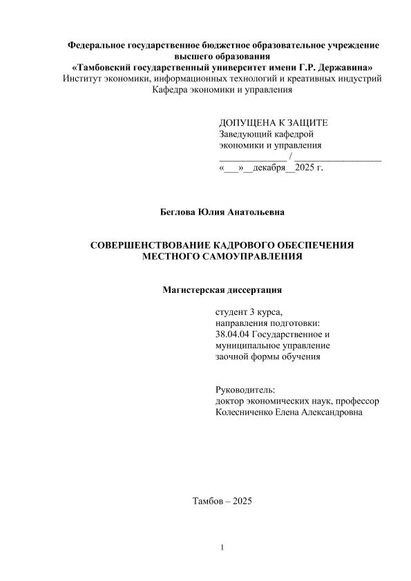 БЕГЛОВА, ЮЛИЯ АНАТОЛЬЕВНА. СОВЕРШЕНСТВОВАНИЕ КАДРОВОГО ОБЕСПЕЧЕНИЯ МЕСТНОГО САМОУПРАВЛЕНИЯ [Электронный ресурс]: магистерская диссертация: 38.04.04 Государственное и муниципальное управление: Заочная форма обучения / Ю. А. БЕГЛОВА; ТГУ им. Г. Р. Державина ; науч. рук. д. э. н., профессор, Е. А. Колесниченко. — Электрон. текстовые дан. (1 файл). — Тамбов, 2025. — Загл. с титул. экрана. — <URL:https://elibrary.tsutmb.ru/dl/docs/vkr19052.pdf>.