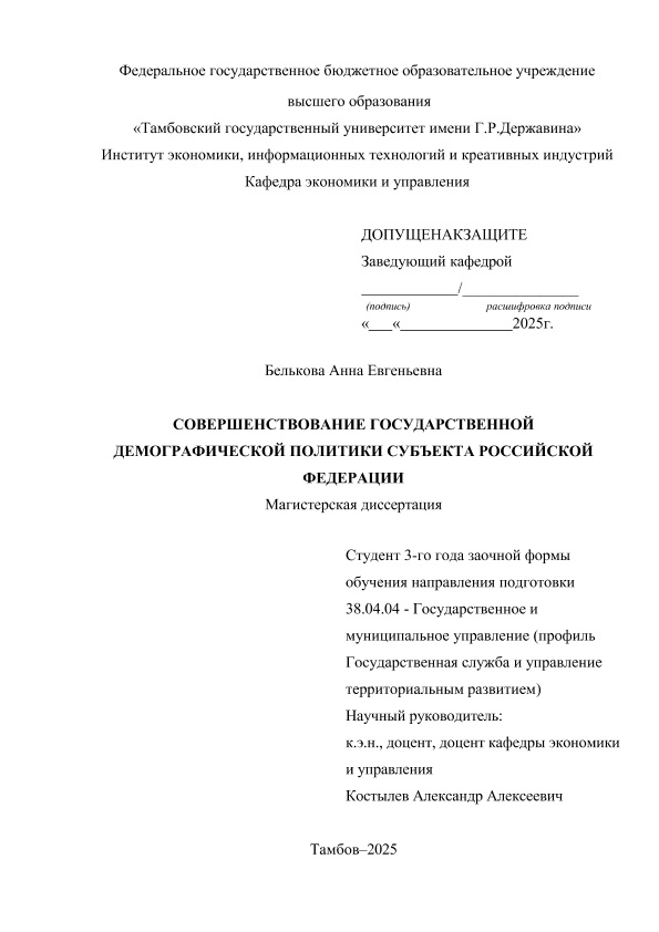 БЕЛЬКОВА, АННА ЕВГЕНЬЕВНА. СОВЕРШЕНСТВОВАНИЕ ГОСУДАРСТВЕННОЙ ДЕМОГРАФИЧЕСКОЙ ПОЛИТИКИ СУБЪЕКТА РОССИЙСКОЙ ФЕДЕРАЦИИ [Электронный ресурс]: магистерская диссертация: 38.04.04 Государственное и муниципальное управление: Заочная форма обучения / А. Е. БЕЛЬКОВА; ТГУ им. Г. Р. Державина ; науч. рук. к. э. н., доцент, А. А. Костылев. — Электрон. текстовые дан. (1 файл). — Тамбов, 2025. — Загл. с титул. экрана. — <URL:https://elibrary.tsutmb.ru/dl/docs/vkr19053.pdf>.