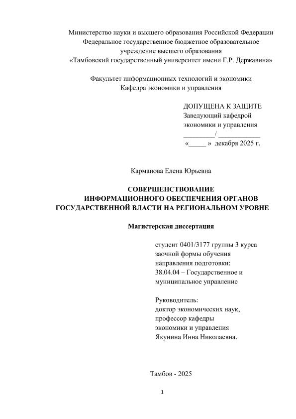 КАРМАНОВА, ЕЛЕНА ЮРЬЕВНА. СОВЕРШЕНСТВОВАНИЕ ИНФОРМАЦИОННОГО ОБЕСПЕЧЕНИЯ ОРГАНОВ ГОСУДАРСТВЕННОЙ ВЛАСТИ НА РЕГИОНАЛЬНОМ УРОВНЕ [Электронный ресурс]: магистерская диссертация: 38.04.04 Государственное и муниципальное управление: Заочная форма обучения / Е. Ю. КАРМАНОВА; ТГУ им. Г. Р. Державина ; науч. рук. д. э. н., профессор, И. Н. Якунина. — Электрон. текстовые дан. (1 файл). — Тамбов, 2025. — Загл. с титул. экрана. — <URL:https://elibrary.tsutmb.ru/dl/docs/vkr19055.pdf>.