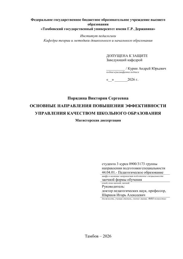ПОРЯДИНА, ВИКТОРИЯ СЕРГЕЕВНА. ОСНОВНЫЕ НАПРАВЛЕНИЯ ПОВЫШЕНИЯ ЭФФЕКТИВНОСТИ УПРАВЛЕНИЯ КАЧЕСТВОМ ШКОЛЬНОГО ОБРАЗОВАНИЯ [Электронный ресурс]: магистерская диссертация: 44.04.01 Педагогическое образование: Управление образовательными системами: Заочная форма обучения / В. С. ПОРЯДИНА; ТГУ им. Г. Р. Державина ; науч. рук. д. пед. н., профессор, И. А. Шаршов. — Электрон. текстовые дан. (1 файл). — Тамбов, 2026. — Загл. с титул. экрана. — <URL:https://elibrary.tsutmb.ru/dl/docs/vkr18707.pdf>.