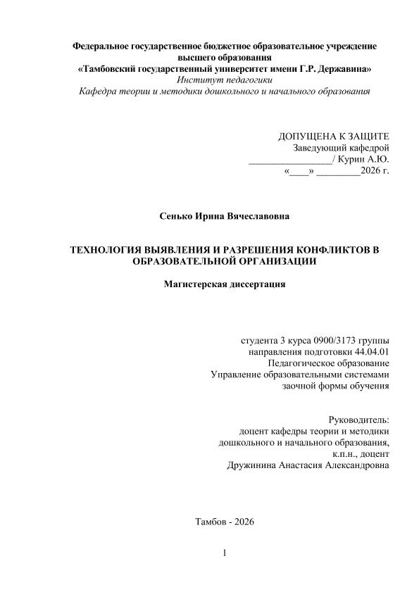 СЕНЬКО, ИРИНА ВЯЧЕСЛАВОВНА. ТЕХНОЛОГИЯ ВЫЯВЛЕНИЯ И РАЗРЕШЕНИЯ КОНФЛИКТОВ В ОБРАЗОВАТЕЛЬНОЙ ОРГАНИЗАЦИИ [Электронный ресурс]: магистерская диссертация: 44.04.01 Педагогическое образование: Управление образовательными системами: Заочная форма обучения / И. В. СЕНЬКО; ТГУ им. Г. Р. Державина ; науч. рук. к. пед. н., доцент, А. А. Дружинина. — Электрон. текстовые дан. (1 файл). — Тамбов, 2026. — Загл. с титул. экрана. — <URL:https://elibrary.tsutmb.ru/dl/docs/vkr18708.pdf>.