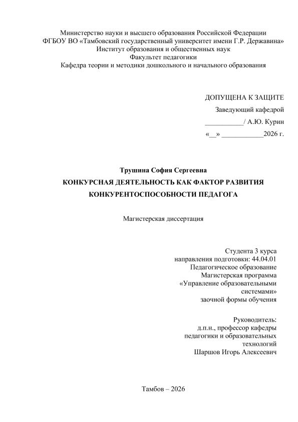 ТРУШИНА, СОФИЯ СЕРГЕЕВНА. КОНКУРСНАЯ ДЕЯТЕЛЬНОСТЬ КАК ФАКТОР РАЗВИТИЯ КОНКУРЕНТОСПОСОБНОСТИ ПЕДАГОГА [Электронный ресурс]: магистерская диссертация: 44.04.01 Педагогическое образование: Управление образовательными системами: Заочная форма обучения / С. С. ТРУШИНА; ТГУ им. Г. Р. Державина ; науч. рук. д. пед. н., профессор, И. А. Шаршов. — Электрон. текстовые дан. (1 файл). — Тамбов, 2026. — Загл. с титул. экрана. — <URL:https://elibrary.tsutmb.ru/dl/docs/vkr18709.pdf>.