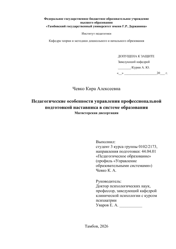 ЧЕВКО, КИРА АЛЕКСЕЕВНА. ПЕДАГОГИЧЕСКИЕ ОСОБЕННОСТИ УПРАВЛЕНИЯ ПРОФЕССИОНАЛЬНОЙ ПОДГОТОВКОЙ НАСТАВНИКА В СИСТЕМЕ ОБРАЗОВАНИЯ [Электронный ресурс]: магистерская диссертация: 44.04.01 Педагогическое образование: Управление образовательными системами: Заочная форма обучения / К. А. ЧЕВКО; ТГУ им. Г. Р. Державина ; науч. рук. д. п. н, профессор, Е. А. Уваров. — Электрон. текстовые дан. (1 файл). — Тамбов, 2026. — Загл. с титул. экрана. — <URL:https://elibrary.tsutmb.ru/dl/docs/vkr18710.pdf>.