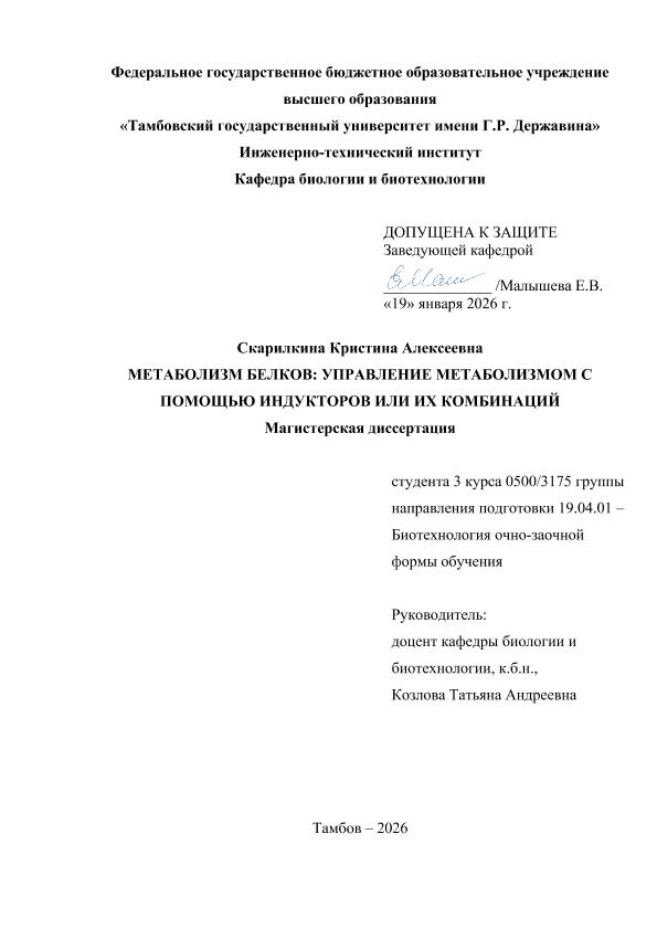 СКАРИЛКИНА, КРИСТИНА АЛЕКСЕЕВНА. МЕТАБОЛИЗМ БЕЛКОВ: УПРАВЛЕНИЕ МЕТАБОЛИЗМОМ С ПОМОЩЬЮ ИНДУКТОРОВ ИЛИ ИХ КОМБИНАЦИЙ [Электронный ресурс]: магистерская диссертация: 19.04.01 Биотехнология: Очно-заочная форма обучения / К. А. СКАРИЛКИНА; ТГУ им. Г. Р. Державина ; науч. рук. к. б. н., доцент, Т. А. Козлова. — Электрон. текстовые дан. (1 файл). — Тамбов, 2026. — Загл. с титул. экрана. — <URL:https://elibrary.tsutmb.ru/dl/docs/vkr18714.pdf>.